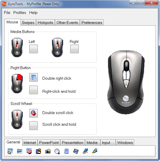 Mit den GyroTools legt Hersteller Gyration der Air Mouse eine sehr umfangreiche Software bei. Diese verbraucht gerade einmal sechs Megabyte Speichervolumen und wird sich somit problemlos überall installieren lassen. Hierbei sollte man noch erwähnen, dass die Maus auch ohne diese Software vom PC erkannt wird und sofort verwendet werden kann. In dem Programm GyroTools gibt es unzählige Einstellungsmöglichkeiten, die speziell für den Luftbetrieb individuell eingerichtet und unter verschiedenen Profilen abgespeichert werden können. Der Programmaufbau gestaltet sich durchgehend logisch, die Bedienung erfolgt intuitiv. Die Funktionen sind in sinnvolle Gruppen eingeteilt. Es gibt auch schon vorgefertigte Profile, die einfach aufgerufen werden können. Im ersten Reitermenü kann man die grundlegenden Mauseinstellungen ändern, in den weiteren Menüs geht es hauptsächlich um das Eventmanagement bei verschiedenen Luftbewegungen und Führungsrichtungen. So kann man zum Beispiel Bildschirm-positionsbezogene Ereignisse einprogrammieren, hier unter dem Punkt Hotspots: