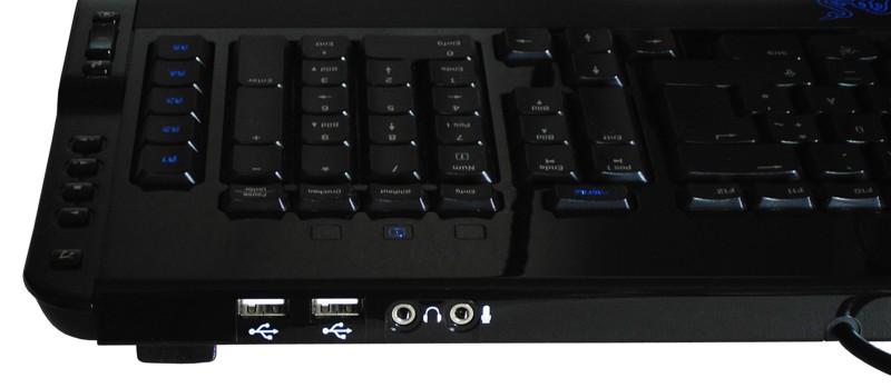 Darüber hinaus ist die Tastatur an der Rückseite mit zwei USB-Anschlüssen ausgestattet, die allerdings nur den USB 1.1-Standard unterstützen. Zusätzlich finden wir zwei handelsübliche 3,5 mm-Buchsen für Kopfhörer und Mikrofon, die ebenfalls an der Rückseite neben den USB-Anschlüssen angeordnet sind. Die Realisierung der Anschlüsse am Rechner wird über ein ausreichend langes, einteiliges Kabel ausgeführt, das sich erst zum Ende hin in die beiden USB-Stecker für die Tastatur und den Hub sowie Mikrofon- und Kopfhöreranschluss verzweigt. Somit hat man hier also eine recht aufgeräumte Lösung vor sich.