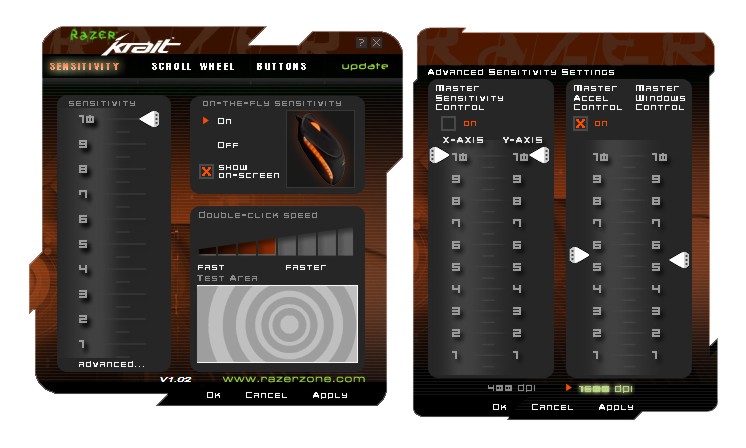 Im Gegensatz zum Treiber der Copperhead sind alle wesentlichen Funktionen in Tabs statt in Flyouts angelegt. Die Tabs sind nebeneinander angeordnet und bieten zahlreiche Einstellungsmöglichkeiten wie etwa die Zuweisung bestimmter Funktionen zu den Tasten, wobei man hier entweder auf vorkonfigurierte Einstellungen zurückgreifen oder den Tasten selbst die gewünschten Funktionen in Form von Makros zuweisen kann. Dabei kann man hinsichtlich der Belegung der Maus zwischen einzelnen Tasten und Tastenkombinationen wählen. Hier sollte sich für jeden Nutzer die passende Auswahl finden. Darüber hinaus lassen sich in Untermenüs weitere umfangreiche Einstellung vornehmen. So kann die Funktion on-the-fly-sensivity aktiviert werden, die es ermöglicht, die Empfindlichkeit der Maus in 0,5-Schritten zwischen 1 und 10 mittels eines Tastendrucks bei gleichzeitiger Betätigung des Rades zu verstellen, ohne dass dazu das Treibermenü geöffnet werden müsste. Zudem bietet sich die Möglichkeit, die Beschleunigung und Geschwindigkeit des Mauszeigers, die Empfindlichkeit der X- und Y-Achse sowie die Doppelklickgeschwindigkeit und anderes mehr einzustellen. Zusätzlich gibt es noch diverse Testfelder, auf denen man die gewählten Geschwindigkeiten vor der Verwendung ausprobieren kann. Auch ein Update des Treibers ist über das Hauptfenster möglich. Insgesamt wird man hinsichtlich der konfigurierbaren Funktionen also nichts vermissen.