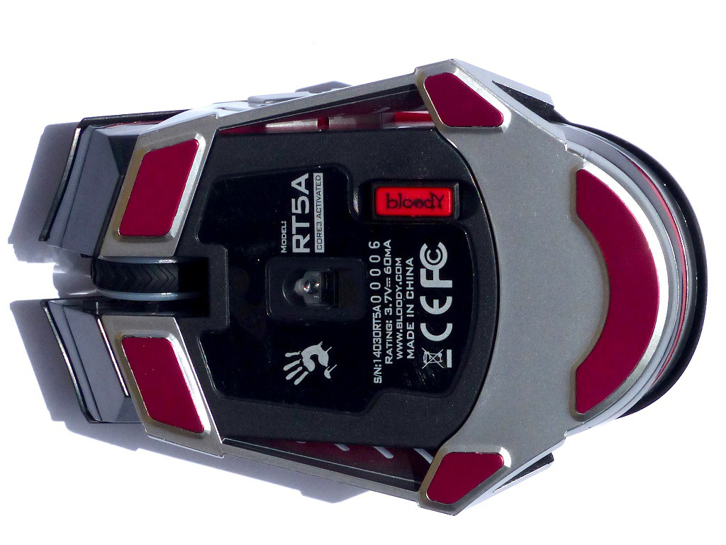 Beim Ersteindruck schwächelt die kabellose RT5A im Vergleich zu ihrem Verwandten der ZL5A. Die Maus hat zwar ein ähnlich markantes und relativ symmetrisches Rechtshänderdesign und eine ähnliche Farbgebung (schwarz und grau), und auch im eingesteckten Zustand leuchtet wieder das Bloody-Logo sowie das Mausrad und ein Designstreifen stimmungsvoll und teils pulsierend rot auf, doch die Maus wirkt nicht so hochwertig. Die Maus weist einige große Spaltmaße auf, die schlecht eingepassten Seiten geben bei Druck nach, die Beleuchtung des Designstreifens ist unregelmäßig, die Metallfüße an der Unterseite scheinen nicht perfekt eingepasst zu sein, da die Maus leicht zu wackeln und zu kratzen neigt. Die beiliegenden ummantelten Kabel fügen sich aber in das übliche rotschwarze Bloody-Design gut ein. Das Ladekabel dient ausschließlich zum Laden, das allerdings auch im Betrieb möglich ist. Leider ist auch hier wieder die Qualität nicht erstklassig, der Kanal für die Kabelführung ist leicht kantig und ein Anstecken daher schwierig. Der Nano-Empfänger kann für den Transport zwar ein Stück aber nicht ganz unten in der Maus versenkt werden.
