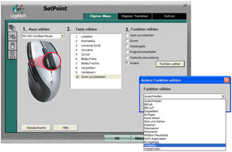 Die SetPoint-Software ist schon seit vielen Generationen verschiedener Logitech-Eingabegeräte ein Begriff und kommt aktuell in Version 2.4 daher. Die Funktionen und möglichen Einstellungen für Maus und Tastatur sind sich dabei sehr ähnlich und umfassen beispielsweise das Ändern der Belegung der "F Mode"-Tasten der Tastatur oder das komplette Abändern der Multimediatasten. Wer zum Beispiel nicht den Windows Media Player mit der MEDIA-Taste starten möchte, kann hier gerne eine externe Applikation ins Spiel bringen und etwa den VLC Media Player zu seinem Standardplayer machen. Ein weiteres spezielles Feature der Tastatur ist das Verschlüsseln der Übertragung, so dass nach ein paar kurzen Schritten der Einrichtung die Übertragung zwischen Funktstation und MX 3000 Cordless Tastatur sicher ist. Neben dem Variieren der Tastenbelegung bietet die MX 600 Lasermaus den so genannten "Spiele-Modus", welcher diverse Einstellung rund um Bewegung, Beschleunigung und weitere Themen bereithält. Alles in Allem eine zufriedenstellende Software, auch wenn sie im Umfang den GyroTools (siehe vorherige Seite) bei weitem nicht das Wasser reichen kann.