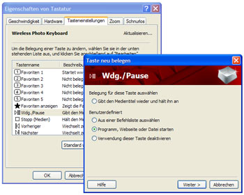 Das Äquivalent im Bereich Software - namentlich IntelliType - ist für die Konfiguration des Photo Keyboards zuständig. Hier stehen wiederum zahlreiche Optionen für das Belegen der einzelnen Standard- und Sondertasten zur Auswahl. Einen separaten Menüpunkt hat man der Zoom-Funktion gewidmet, welche sich somit präzise konfigurieren lässt. Wie bei IntelliPoint, lässt sich auch hier der Status von Signal und Stromversorgung bequem per Software abrufen. Ergänzt wird das Photo Keyboard durch die Beigabe von Microsoft Foto 2006...