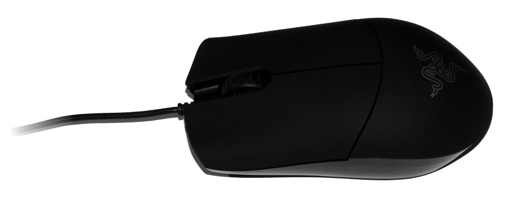 Die Salmosa bietet eine symmetrische Bauform – es wird also keine Händigkeit bevorzugt, aber Razer hatte bisher ohnehin kein spezifisches Rechts- oder Linkshändermodell im Programm. Von oben betrachtet, wirkt die Maus sehr kantig. Die beiden Haupttasten sind wie immer bei Razer deutlich von der Oberschale getrennt und besitzen eine recht gerade Formgebung, denn weder sind die Tasten stark tailliert noch bieten sie so deutliche Auflagepunkte für die Finger wie etwa bei der Lachesis. Lediglich zwei kleine Kuhlen am vorderen Ende der Tasten helfen, die Finger zu positionieren. Die Tasten selbst und das Heck der Maus sind mit der Razer-typischen gummiartigen Beschichtung versehen, die sich erfreulicherweise auch im Dauerbetrieb kaum abnutzt, wie wir bei unserem redaktionseigenen Modell der Razer Krait bereits feststellen konnten. Das Heck wird durch das Razer-Logo geziert, das in Weiß gehalten ist. Allerdings muss man auf eine Beleuchtung verzichten – ein Zugestädnis an den niedrigen Preis.
