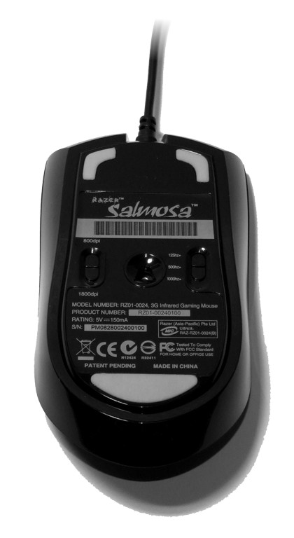 Hinsichtlich des Sensors hat die Salmosa den bekannten 3G-Infrarotsensor, wie wir ihn bereits von der Diamondback 3G kennen, an Bord. Dieser bietet eine Auflösung von wahlweise 800 bzw. 1800 dpi. Umschalten kann man die Auflösung des Sensors allerdings nur auf eine Art: durch einen kleinen Schalter an der Gehäuseunterseite. Hier finden wir insgesamt zwei kleine Schalter, wie die nebenstehende Abbildung zeigt. Dabei dient der linke Schalter der bereits erwähnten Verstellung der Auflösung, mittels des rechten lässt sich die Polling Rate zwischen 125, 500 und 1000 Herz umschalten. Diese Eigenschaften können allerdings nicht über die Software zugewiesen werden, doch dazu mehr auf der folgenden Seite.
