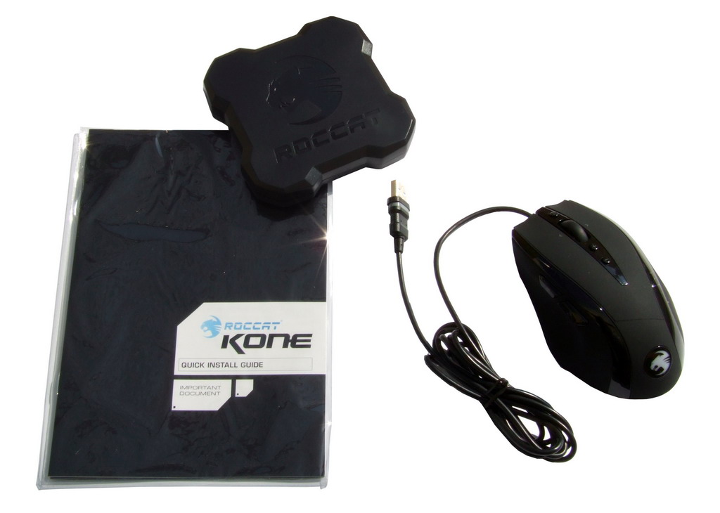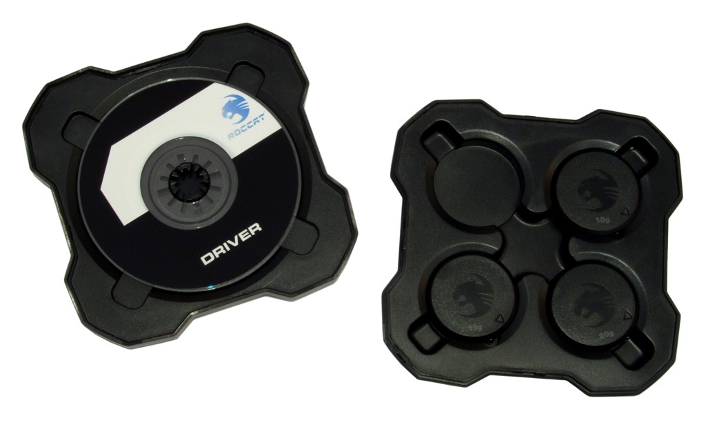 Roccat liefert die Kone mit einer Palette an Beigaben aus: So finden wir neben der Maus eine Kurzanleitung, eine Box mit Gewichten zu 5, 10, 15 und 20 Gramm, eine Treiber-CD sowie als besonderes Gimmick Die Akte Inari, in der die pseudowissenschaftlich dokumentierte Entdeckung des Aimo, eines neuen chemischen Elements, das die Eigenschaften der Roccat-Produkte maßgeblich bestimmen soll, beschrieben wird. Diese Beigabe ist zwar unnötig, aber witzig und hebt sich vom martialischen Auftreten manch anderer Hersteller etwas ab. Zudem enthält die Verpackung noch eine ID-Card in der Machart einer Kreditkarte, mit der man sich auf der Roccat-Homepage kostenlos registrieren kann, um Zugriff auf zusätzliche Angebote des Herstellers zu erhalten.