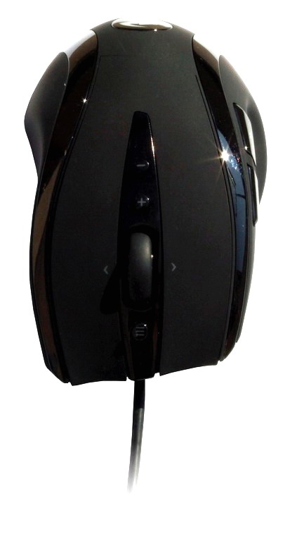 Die Oberschale der Maus bietet neben den beiden großen Haupttasten und dem Vier-Wege-Rad drei zusätzliche Tasten auf der Oberseite, die mittels des Treibers frei belegt werden können. Im Auslieferungszustand bieten die beiden Tasten eine Verstellung der DPI-Zahl, können aber auch anders belegt werden. Die kleine Taste vor dem Rad ruft in der Standardeinstellung das Windows-Menü auf, kann aber ebenfalls umbelegt werden. Die Haupttasten sind mit einer Kuhle versehen, so dass die Finger guten Halt finden und angenehm aufliegen. Das Mausrad bietet deutliche Raststufen und fungiert zugleich als dritte Taste. Die Vier-Wege-Funktion entspricht der, wie man sie von anderen Mäusen auch kennt.