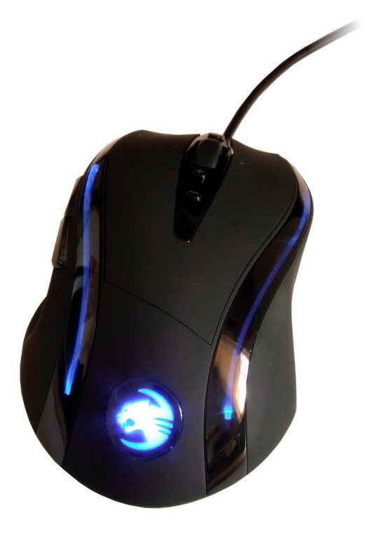 Die Haupttasten werden vom restlichen Mauskörper durch zwei Einsätze aus teilweise durchsichtigem Kunsstoff getrennt, die die Beleuchtungselemente enthalten. Auf der linken Seite finden sich zwei Tasten, die etwa der Umschaltung im Browser dienen, aber natürlich auch anderweitig genutzt werden können. Jede der genannten Tasten lässt sich natürlich auch mit Makros, Shortcuts u.a.m. belegen. Zudem arbeiten alle Tasten sehr definiert und sitzen auch nicht klapperig im Gehäuse, wie man das bei manch anderem Maus-Modell schon erlebt hat. Auf linken Gehäuseseite der Maus findet sich eine Kuhle für den Daumen, die recht Seite bietet eine relativ gerade, mit dem Roccat-Schriftzug versehene Auflagefläche für die Finger, so dass die Hand insgesamt bequem positioniert werden kann. Das Heck der Maus wird von einem Roccat-Logo geziert, das hinsichtlich der Beleuchtung ebenfalls individuell eingestellt werden kann. Die Oberseite der Maus ist komplett mit einer gummiartigen Beschichtung versehen, die sich angenehm greift. Abrutschen ist also eher unwahrscheinlich.