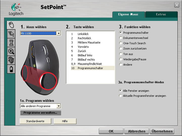 Die Version der SetPoint-Software, die auf der CD mitgeliefert wurde, trug die Versionsnummer 4.60a, wir haben allerdings die aktuellste Version (4.70) aus dem Internet für unseren Test verwendet. Der Treiber fällt wie Logitech-üblich mit ca. 50 MB äußerst groß aus, die Software erkennt dafür aber auch gleich unsere anderen Logitech-Mäuse. Die Softwareinstallation verlief problemlos unter Windows XP sowie Windows Vista, die Maus wurde aber auch ohne Software sofort beim Einstecken des Empfängers erkannt und war betriebsbereit. Ansonsten ist die MX 1100 von Logitech auch für den Betrieb an Mac-basierten Systemen konzipiert und entsprechende Treiber sind verfügbar.