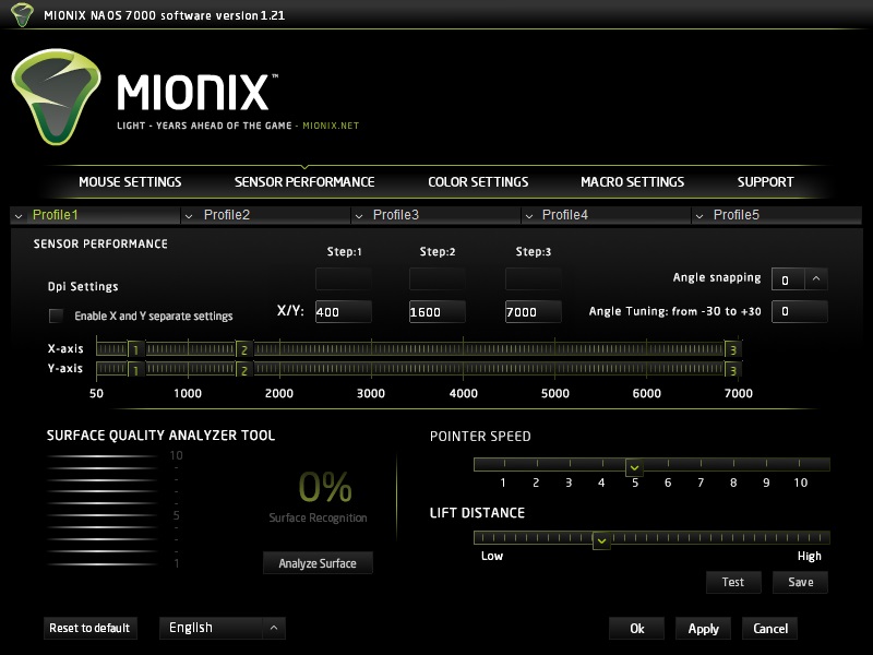 Mionix hat eine benutzerfreundliche Software geschaffen, die installiert 50 MB Festplattenspeicher belegt und einige Einstellungsmöglichkeiten bietet. Diese Einstellungen werden auch direkt im integrierten Speicher der Maus hinterlegt und die Software kann gegebenenfalls wieder deinstalliert werden. Als Kunde vermisst man nicht allzu viel in der Software. Doppelklickgeschwindigkeit, Scrollgeschwindigkeit, Mausbeschleunigung, Polling Rate (125 Hz bis 1.000 Hz), und die Tastenbelegung können relativ frei definiert werden. Auch wenn die Tasten mit Tastaturanschlägen und Makros belegt werden können, ist die direkte Mediaplayer-Steuerung nicht möglich. In den fünf verschiedenen Profilen können auch CPI, angle snapping, angle tuning, die Zeigergeschwindigkeit und die Lift-Off-Distanz eingestellt werden. Das Surface Quality Analyzer Tool analysiert die Oberfläche unter der Maus und zeigt die Erkennungsrate an. Damit kann eine ungeeignete Oberfläche schnell enttarnt werden. Bei der Beleuchtung der Maus kann aus 16,8 Millionen Farben gewählt werden, die langsam wechselnd, blinkend, pulsierend, atmend oder als Dauerbeleuchtung gewählt werden können. Bei Bedarf ist auch ein Deaktivieren möglich.