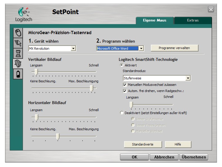 Im Hauptfenster lassen sich alle wesentlichen Eigenschaften der Maus wie Zeigerbeschleunigung, Zeigergeschwindigkeit, freie Tastenzuweisungen, Erkennung von Spielen durch die SetPoint-Software und anderes mehr konfigurieren. Dabei kann man wählen, ob man die Einstellungen aus dem Betriebssystem oder der SetPoint-Software übernehmen möchte. Eine Justierungsmöglichkeit der Doppelklick-Geschwindigkeit fehlt allerdings. Die Tastenzuweisungen können weitgehend individuell erfolgen und man kann aus einer umfangreichen Funktionspalette auswählen oder den Tasten auch Makros zuweisen. Es können einzelne Tasten oder ganze Tastenfolgen des Keyboards zugewiesen werden, so dass man häufig genutze Tastenkombinationen direkt auf die Maus legen kann. Das ist sowohl in Anwendungen als auch Spielen nützlich. Hier sollte sich also ein passendes Setup finden. Daneben gibt es noch Tabs für die Zuweisung der Laufgeschwindigkeit des Rades sowie eine Anzeige des Batteriezustandes. Speziell der Tab für das Rad hat es in sich, denn hier kann man für eine ganze Palette von Anwendungen individuell festlegen, mit welcher Geschwindigkeit das Rad arbeiten und wann es in welcher Anwendung in den Free-Spin-Modus umschalten soll. Darüber hinaus kann auch das Verhalten des Daumenrades festgelegt werden, so dass man ihm wahlweise je nach Anwendung die Umschalt- oder Zoomfunktion zuweisen kann. Der Tab zur Erkennung von Spielen ist eher rudimentär gehalten, aber das verwundert nicht, wenn man den Einsatzzweck der MX Revolution berücksichtigt. Auf umfangreiche Einstellungsmöglichkeiten hinsichtlich der Abtastraten wie etwa bei der Logitech G5 muss man somit verzichten. Möglicherweise wird man manches Feature vermissen, aber dennoch sind die gängigen Funktionen problemlos steuerbar.