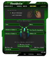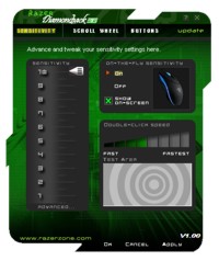 Der Maus liegt eine Treiber-CD mit der Razer-Software für die Diamondback 3G bei, die der Version auf der Razer-Homepage entspricht und die Versions-Nummer 1.00 trägt. Erfreulich ist, dass der Treiber mit knapp 7,2 MB sehr klein ausfällt. Das kennt man in Form von 60 MB oder mehr messenden Treiberpaketen auch anders. Allerdings vermissen wir nach wie vor eine UDA (Unified Driver Architecture), so dass für alle Razer-Maus- bzw. Tastatur-Produkte ein einheitlicher Treiber vorliegt. Das hatten wir schon oft angesprochen. Die Razer-Software legt wie gewohnt ein Icon in der Schnellstartleiste an, so dass man direkt darauf zugreifen kann. Danach erscheint das Hauptfenster des Treibers. Hier fällt auch wieder die Razer-typische schwarz dominierte Farbgebung auf, die im Falle der 3G mit Grüntönen kontrastiert ist. Allerdings wäre es wünschenswert, wenn Razer noch ein entsprechendes Skin-File nachlegt, denn auf den ersten Blick erscheint das Hauptfenster etwas unübersichtlich. Razer möchte sich mit seinen Treibern auch optisch von der Masse abheben, doch muss man das nicht über derart kleine Schriften und dunkle Farben machen. Dennoch findet man sich nach kurzer Zeit zurecht.