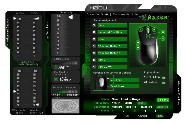 Ein Gimmick ist die Möglichkeit, die Beleuchtung der Leiste und des Rades abzuschalten – wirklich Sinn macht das nicht. Darüber hinaus kann die Funktion ‚On-the-fly-sensivity’ zur Einstellung der Empfindlichkeit auf die Radtaste gelegt werden. Das ist allerdings sinnvoll, denn drückt man das Rad und dreht es anschließend, hat man Zugriff auf diese Funktion, kann das Rad aber ohne Tastendruck nach wie vor zum Scrollen nutzen. Diesen Punkt hatten wir bei der Krait kritisiert, da dies hier nicht möglich war. Störend ist auch, dass die Software jede Änderung der Einstellungen damit quittiert, dass die Maus einen Augenblick lang nicht mehr reagiert. Die Reaktionszeit zur Übernahme der Einstellungen dauert also etwas. Fragen muss man sich auch, warum Razer nicht allmählich zu einer UDA (Unified Driver Architecture) übergeht, wie es bei Logitech oder Microsoft schon länger Standard ist. Das würde das Durcheinander verschiedener Treiberversionen und modellabhängiger Varianten deutlich entwirren und dem (unerfahrenen) Endanwender das Leben erleichtern. Insgesamt hinterlässt die Software der Habu keinen runden Eindruck – das muss man leider so konstatieren. Möglicherweise ändert sich hier in den nächsten Monaten noch etwas.