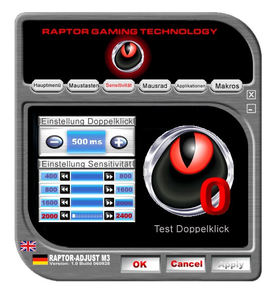 Die mitgelieferte Software der M3 lässt uns ein wenig ratlos zurück: Ein ausgereifter Treiber sieht anders aus, das muss an dieser Stelle festhalten. Bei der M3 wird die ‚Raptor Adjust-Software’ mitgeliefert, die in der Theorie über eine umfangreiche Funktionspalette verfügen soll – in der Praxis haperte es damit etwas. Nach dem Anschließen der Maus an den Rechner kann die Software installiert werden. Das funktioniert soweit problemlos, denn nach dem Einlegen der CD wird automatisch ein Installationsdialog aufgerufen. Der Treiber wird zweisprachig installiert (deutsch und englisch). Diese Idee ist soweit gut, doch hilft das nicht viel: Weder gibt es eine Online-Hilfe, noch ist die Dokumentation sonderlich hilfreich oder informativ ausgefallen, so dass wir uns im Treiber erst mühsam zu Recht finden mussten.