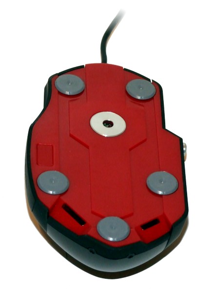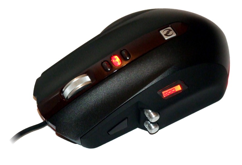 Die beiden gut funktionierenden Haupttasten flankieren einen dunkelrot abgesetzten Mittelbalken, auf dem die drei Tasten für die dpi-Verstellung, das Mausrad sowie die Schnellstart-Taste angeordnet sind. Letztere ist durch das prägnante SideWinder-Logo gekennzeichnet und ruft das Treibermenü auf. Die Verstellung des dpi-Wertes kann den dpi-Tasten im Treiber zugewiesen werden. Dabei ist es möglich, Intervalle von 100 dpi im jeweiligen Bereich festzulegen. Die gewählte Auflösung wird auf zwei Wege signalisiert: Zum Einen ist die Taste mit der jeweils gewählten Auflösung beleuchtet, zum Anderen wird die Auflösung in einem kleinen Display auf der linken Seite der Maus angezeigt. Die Auflösung wird eingeblendet, wenn man eine der dpi-Tasten betätigt oder die aktuell gewählte Einstellung nochmals drückt. Das ist schön gelöst, denn so hat man jederzeit den Überblick, welche Einstellung angewählt ist. Das Rad wiederum besteht ebenfalls aus Aluminium und fungiert als dritte Taste. Bei einem Klick auf das Rad wird die Schnellscroll-Funktion aktiviert. Dabei fühlt sich das Rad vergleichbar dem der Logitech Revolution an, allerdings ohne die aufwändige Mechanik. Allerdings könnten die Raststufen etwas definierter sein, aber dennoch gewöhnt man sich schnell daran.