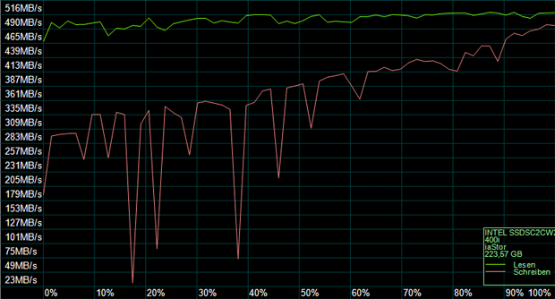 Wie die unten folgende Grafik verdeutlicht, profitiert das Laufwerk von der Kompressions-Technologie des SandForce-Controllers. Je stärker die Daten komprimiert werden können, umso höher fällt die Schreib-Geschwindigkeit aus. Perfekt komprimierbare Daten lassen sich fast 3-mal so schnell auf den NAND-Chips der SSD 520 speichern wie nicht komprimierbare Daten.