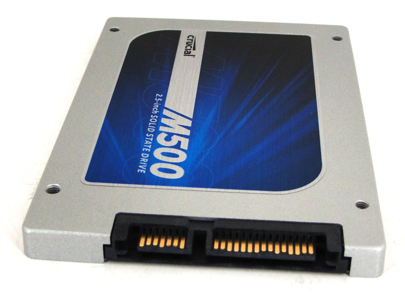 Insgesamt 16 Speicherchips vom Typ MLC (Multi-Level Cell) sind bei unserem 480 GB Testmuster gleichmäßig auf Vorder- und Rückseite des PCBs untergebracht. Die von Micron stammenden 20 nm NAND-Flash-Speicher tragen den FBGA-Code NW526 (MT29F256G08CECABH6-6) und können jeweils bis 32 Gigabyte Daten fassen, was in Summe somit 512 Gigabyte Speicherkapazität ergibt. Diese stehen dem Kunden jedoch nicht vollständig für die Datenspeicherung zur Verfügung (~447 GB formatiert), da ein separater Block für "Over-Provisioning" reserviert wird – dieser dient typischerweise dem Ausgleich defekter Speicherzellen und erhöht die Lebensdauer von Solid State Drives. Die von Marvell RAIN (Redundant Array of Independent NANDs) gennante Technologie verhinder Datenverlust beim Defekt von Speicherzellen – äquivalent zu RAISE von SandForce-Controllern. Dadurch kann die M500 mit 480 GB 72 TBW (Total Bytes Written) garantieren, was wiederum einer Datenmenge von etwa 40 GB pro Tag über einen Zeitraum von 5 Jahren entspricht. Flankiert wird der Marvell-Controller von einem 1 GB großen DDR3-DRAM-Cache aus dem Hause Micron (FBGA D9QLJ, DDR3-1600). Seitens der Verschlüsselungstechnologien unterstützt die M500 TCG Opal 2.0 und IEEE1667.