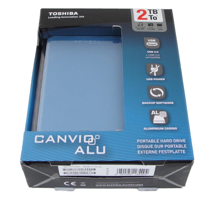 Der Lieferumfang der externen Toshiba-Festplatte im Überblick.