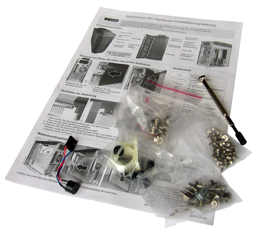 Der Lieferumfang des Lian Li PC-P60 Armorsuit besteht wie üblich aus verschiedenen Schrauben, Kabelbindern, Mainboardhaltern und vielen weiteren Kleinteilen. Mit dabei ist außerdem ein PC-Speaker für die direkte Montage auf dem Mainboard (einfach auf Pin-Header des Boards aufstecken). Ein sehr praktisches Werkzeug hat man in Form eines Schraubendrehers für die 8-kantigen Mainboardhalter beigelegt, so dass man direkt mit der Installation der Komponenten beginnen kann. Nicht zu vergessen sind zudem fünf (!) vormontierte Gehäuselüfter in verschiedenen Größen, auf die wir im weiteren Verlauf des Artikels noch einmal genauer eingehen werden.