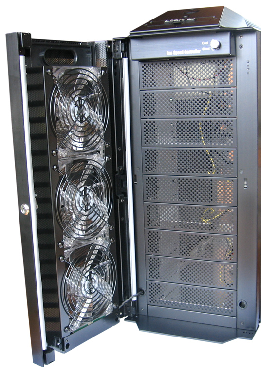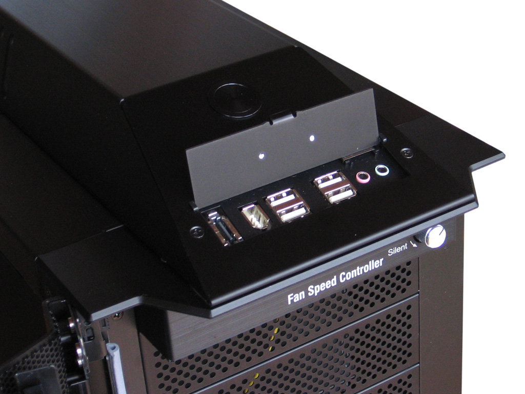 Die Status-LEDs für Power und HDD befinden sich an der Front bzw. genauer gesagt an der Tür, die die gesamte Front abdeckt und per Schlüssel (im Lieferumfang in zweifacher Ausführung) den Zugang zu den externen Laufwerken verwehrt. Die Kontaktflächen zum Gehäuse wurden mit einem Gummistreifen versehen, der Geräusch verursachende Vibrationen absorbiert und damit ein Klappern der Gehäusetür verhindert. In diese Fronttür (massive Konstruktion aus Aluminium) integriert sind drei vormontierte 120 mm Blue LED Lüfter, die frische Kaltluft in das Gehäuseinnere befördern und damit maßgeblich für die Temperaturregulierung verantwortlich sind. Damit die Luft von Außen in das Innere des Gehäuses strömen kann, sind die Abdeckungen der Laufwerksschächte aus Lochblech, können alternativ aber auch mit einem einfach Klick-Verfahren komplett entfernt werden. Damit die Komponenten vor unnötiger Verstaubung von Außen geschützt sind, befindet sich in der Tür ein einfach herausnehmbarer und abwaschbarer Staubfilter. Für die Steuerung der Drehzahl steht eine rudimentere Lüftersteuerung zur Verfügung, die in der Gehäusefront integriert ist. In der Grundkonfiguration sind daran die drei vorderen Lüfter in der Tür und der Lüfter im Aufsatz oben angeschlossen.