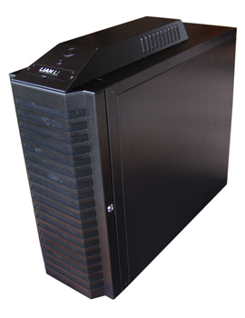 Beim Lian Li PC-P60 Armorsuit aus gebürstetem Aluminium und schwarzer Lackierung handelt es sich um ein herkömmliches ATX-Gehäuse, das auf eine traditionelle Anordnung der Komponenten setzt. Für die Installation der Hardware stehen dem Benutzer, bei Vernachlässigung der nach Hinten hinausstehenden Schrauben, 211 x 495 x 541 mm (B x H x T) an Volumen zur Verfügung. Besonders auffällig ist dabei der obere Aufsatz, der einen weiteren 140 mm Blue LED Lüfter (bläst Warmluft nach außen) beherbergt und zudem verschiedene Anschlüsse bietet. Dazu gehören ein eSATA-Anschluss für externe Festplatten, ein 6-Pin FireWire-Anschluss, vier USB 2.0-Anschlüsse und die obligatorischen Audio-Ports für den Anschluss eines Kopfhörers (jeweils 3,5 mm Klinke). Abgeschlossen wird der Front-Panel-Bereich durch eine kleine Alu-Schutzklappe mit "Lian Li"-Aufschrift. Direkt dahinter und dadurch ebenfalls hervorragend zu erreichen, falls der PC auf dem Boden steht, der Power- bzw. der Reset-Button - beide aus Aluminium.