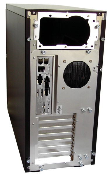 Die Rückseite des Gehäuses unterscheidet sich ebenfalls in ihrem Aufbau von herkömmlichen Gehäusen. So findet man hier mehrere Besonderheiten. Der rückseitige Lüfter saugt kühle Frischluft für die CPU an, statt wie üblich Warmluft nach hinten abzuführen. Daher ist auch das eingebaute Staubgitter sinnvoll. Die Montage des Netzteils erfolgt ebenfalls mittels Rändelschrauben. Zusätzlich kann die hintere Netzteilöffnung nach dem Einbau mit einem PSU-Duct versehen werden, wodurch die Warmluft zur Seite abgeführt wird. Diese Maßnahme ist sinnvoll, da so der rückseitige 80 mm-Lüfter die Warmluft des Netzteils nicht einfach wieder ins Gehäuse zieht. Zudem verfügt die Rückeite über eine Vorrichtung zur Montage eines kleines Vorhängeschlosses, sodass auch hier unbefugte Zugriffe unterbunden werden können.