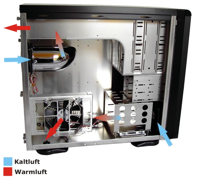 Somit geht Lian Li mit dem PC-6070 Plus II einen dritten Weg: Man versucht, die Möglichkeiten zur Kühlung, die der ATX-Standard bietet, maximal zu nutzen. Üblicherweise sieht das ATX-Konzept vor, dass kalte Luft vorne am Gehäuse eingesaugt wird und die Komponenten kühlt, um anschließend nach hinten und oben abgeführt zu werden, weil warme Luft bekanntlich aufsteigt. Hier setzt Lian Li an, indem man die Verhältnisse gewissermaßen umkehrt. So wird zwar nach wie vor ein Teil der kalten Luft vorne angesaugt, aber diese wird nur zur Kühlung der Festplatten und der Grafikkarten verwendet. Die so erwärmte Luft wird über einen 120 mm-Lüfter in Höhe der Grafikkarten abgesaugt und nach außen geführt.