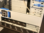 Jetzt zur Ausstattung die standardmäßig in jedem Gehäuse vorgefunden werden kann. Das Gehäuse kann insgesamt elf Laufwerke unterbringen, davon sind zwei für Floppylaufwerke vorgesehen, oder als Erweiterungungsslot für einen internen USB-Hub oder ähnlichem. Für CD- und DVD-Laufwerke stehen dem Käufer insgesamt vier Slots zur Verfügung, betrachtet man den Tower von Innen, wird deutlich, dass diese Art von Gehäuse für den geräuscharmen Betrieb ausgelegt ist - drei weitere interne 5,25 Zoll Laufwerksschächte lassen sich mit dem HD-Silencer verbinden. Leider fehlt es an 3,5 Zoll Laufwerksschächten, da sich neben den zwei Floppyeinbaumöglichkeiten nur noch eine weitere ungedämmte Festplatte ohne Adapter in den Tower integrieren lässt.