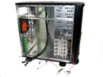 In Sachen Ausstattung hat das Gehäuse innerlich als auch äußerlich einiges zu bieten. So ist im Inneren ein seperater, herausnehmbarer Festplattenkäfig vorhanden, welcher Platz für bis zu fünf Festplatten bietet. Zudem liefert Thermaltake passend für diesen Käfig die enstprechenden "Daumenschrauben" mit, welche für eine einfache, werkzeuglose Montage der 3,5 Zoll Festplatten dienen. Eine Etage höher befinden sich zwei weitere 3,5 Zoll Einschübe, welche entweder für Diskettenlaufwerke oder noch zwei zusätzliche Festplatten genutzt werden können. Auch dieser Laufwerkskäfig lässt sich herausnehmen. Sehr positiv ist, dass bis auf die Mainboard-Montage kein Schraubendreher oder anderes Werkzeug benötigt wird, denn auch die Laufwerke lassen sich dank der mitgelieferten Führungsschienen schnell und einfach integrieren. Hinter der Frontpartie, welche sich in zwei Stufen öffnen lässt, verbirgt sich neben Power-Button, Reset-Knopf und Kontrollleuchten noch der auswechselbare Staubfilter, welcher für saubere Luft sorgt. Allerdings sammelt sich in dem Raum zwischen der Aluminium Frontklappe und den dahinter liegenden Laufwerken auch einiges an Staub auf der empfindlichen Oberfläche - so muss recht oft zum mitgelieferten Staubtuch gegriffen werden.