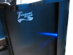 Das Thermaltake Tsunami VA3000BNA setzt in Sachen Design nicht auf eine besonders auffallende Optik sondern mehr auf "understatement". Die schwarze Lackierung mit Spiegel-Effekt zieht zusammen mit der matten Aluminium Front, den Silberapplikationen und den dezenten blauen LEDs dennoch viele Blicke auf sich. Dennoch gilt auch hier: "Wer schön sein will muss leiden", denn auf der Oberfläche sieht man sofort jeden Fingerabdruck, Staubkrümel oder Kratzer - Vorsicht ist also geboten! Nichts desto Trotz kann auch hier das mitgelieferte Mikrofaser-Tuch seine Künste beweisen. Ganz im farblichen Kontrast stehen allerdings die Lüfter im Inneren - knalliges Thermaltake-Orange steht hier an der Tagesordnung. Die Optik wird durch die Lüfter aber nicht gestört, denn schließlich sieht man jene bei geschlossenem Gehäuse nicht.