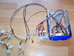 Nun hier zum wohl interessantesten Teil des Artikels: Zu den Extras zählen unter anderem die beiden Lüftersteuerung - eine in der Fronttür mit lediglich zwei Potis und der Thermaltake Hardcone. Dann natürlich noch die Leuchtschrift an der Front, die wahlweise immer leuchtet oder in drei Stufen blinkt, wobei dies dann auf Dauer auch nervig sein kann. Die fünf mitgelieferten Gehäuselüfter, alle aus dem Hause Thermaltake, sind alle mit weniger als 21 dB angegeben. Dies erweist sich auch als korrekt, die Lüfter sind relativ leise, wobei dies nicht leicht zu bewerten ist, denn jeder hat eine eigene Auffassung von Silent oder Normallautstärke. Zwei der 92 mm Lüfter sind aus klarem Kunststoff gefertigt und mit blauen LEDs versehen. Die in der Fronttür verbauten Potis sind mit einem zweiten Kabel mit den steuerbaren Lüftern verbunden. Alle mitgelieferten Lüfter haben einen 4-Pin Molex-Netzteil Stecker und ein extra Lüftersignalkabel, somit müssen sie nicht den Strom vom Mainboard beziehen, können aber dennoch ein Signal senden, welches die momentane Umdrehungszahl beinhaltet. In das X-förmige Window ist der Firmenname Thermaltake eingraviert, der bei richtiger Beleuchtung blau erscheint. Die PCI- und AGP-Steckplatzbefestigungen sind wie beim Casetek 1018 mit kleinen Klammern versehen, für den Schraubenlosen Tausch von Karten. Leider ist dieses System bei etwas breiteren Platinen nicht mehr einsatzfähig und muss komplett entfernt werden.