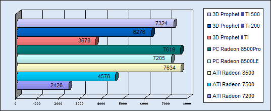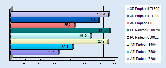 Die folgenden Diagramme sollen die Leistungen der Karten wiederspiegeln. Als Vergleichwerte wurden die bereits getesteten Hercules Titanium Karten verwendet. Zu jedem Benchmark-Programm wurden jeweils zwei Diagramme (für 1024 und für 1280) erstellt. Das erste der Beiden zeigt die Werte in 1024x768...