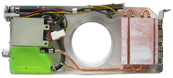 Auf den ersten Blick mag man gar nicht glauben, dass Hersteller Sapphire in gemeinsamer Entwicklung mit Kühlungsspezialist Thermaltake eine gesamte Wasserkühlung auf die Größe einer herkömmlichen Add-In-Karte geschrumpft hat, doch auch das nähere Hinsehen lässt keine Zweifel daran aufkommen. Die gesamte Konstruktion beherbergt einen Ausgleichsbehälter, eine 12V Mini-Pumpe und einen massiven Radiator - Installation via Slot-Bracket und PCI-kompatible Steckverbindung. Letzterer ist an die metallische Seite des Toxic-Gehäuses gekoppelt und erhält damit eine weitere Abfuhrmöglichkeit für die entwickelte Wärme. Inmitten des ganzen finden wir einen LED-Lüfter (Farbe: blau), der sich in zwei verschiedenen Stufen betreiben. Zwei Betriebsdrehzahlen ermöglichen wahlweise leiseren Betrieb oder höhere Leistung: 18 dBA bei 2000 U/Min bzw. 26 dBA bei 2500 U/Min. Als Redakteur und Anwender hätten wir uns an dieser Stelle eine stufenlose Regelung gewünscht - versierte Bastler und Hobby-Elektroniker können hier jedoch problemlos noch nachbessern und perönliche Vorlieben ins Spiel bringen.