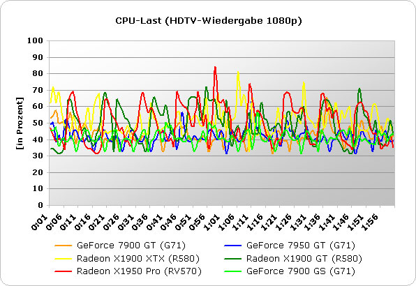 Ein neuer Punkt in unserem Benchmarkparcour ist auch die HDTV-Wiedergabe. So testeten wir, ob bzw. wie gut unsere Kandidaten WMV-Videos in HDTV-Qualität beschleunigen können. Bereits in der GeForce 6 Generation sollte eine Hardware-Beschleunigung von WMV-Videos dank PureVideo erfolgen, doch diese ist bis heute beim NV40/NV45 nicht vorhanden. Aus dem folgendem Diagramm lässt sich allerdings deutlich erkennen, dass Nvidia bei der GeForce 7 Serie seine Hausaufgaben erledigt hat. Als Testvideo kam ein 128 MB großes HDTV-Video von Nvidia in der Auflösung 1.920 x 1.080 (1080p) zum Einsatz.