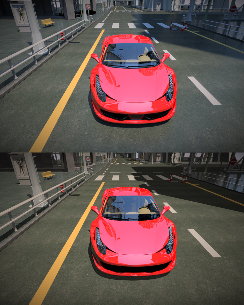 Die Herausforderung an die GPU-Technik ist die Tatsache, dass sich die Strahlen in kaum vorhersehbare Richtungen ausbreiten können und daher zahlreiche, zufällige Speicherzugriffe erfordern. Die für lineare Zugriffe optimierte Speicher-Architektur hat hier ihre Schwächen, weshalb sich die Nvidia-Entwickler unter anderem auf die Anpassung der L1- und L2-Caches konzentriert haben. So wird nach eigenen Angaben die Raytracing-Berechnung deutlich beschleunigt und ein Rendern in Echtzeit soll mit Nvidias GF100 erstmals möglich sein. Tatsächlich erreicht man im interaktiven Rendermodus der "Design Garage" zweistellige Framerates (GeForce GTX 470 im Referenzdesign) und die Ergebnisse können sich sehen lassen! Im HQ-Modus dauert das Rendering deutlich länger, dafür sind die Ergebnisse nochmals deutlich verbessert und kommen der Realität sehr nahe. Folgend ein paar Aufnahmen im direkten Vergleich (HQ vs. Interaktiv).