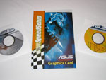 Bei den genannten Datenträgern handelt es sich zum einen um die Treiber-CD, welche einen aktuellen Nvidia ForceWare Treiber zum Betrieb der Grafikkarte beherbergt und ein Asus-Tool mit dynamischer Overclocking Funktion bietet. Des Weiteren finden wir noch Asus DVD XP, CyberLink PowerDirector 3, CyberLink MediaShow SE und das Game Joint Operations von Entwickler Novalogic - vier der sechs CDs lassen sich bequem im mitgelieferten Asus CD Suite unterbringen. Somit kann man nach dem Erwerb der neuen Karte gleich mit dem Spielen beginnen. Bei dem erwähnten Handbuch handelt es sich besser gesagt um eine Kurzanleitung, welche unter anderem die wichtigsten Schritte in deutscher Sprache enthält - SpeedSetup. Eine ausführlichere Version wird auf CD mitgeliefert.