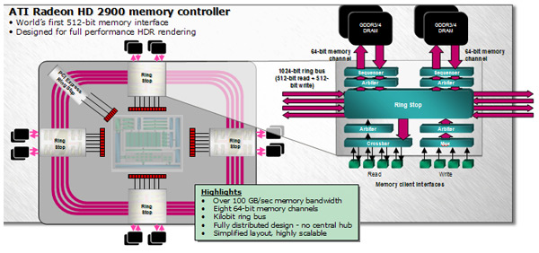 Wieder mit dabei ist das bereits von vorherigen Generationen bekannte Ringbus-Speicherinterface, welches man nun auf insgesamt 1024 Bit (512 Bit in jede Richtung des Rings) aufgestockt hat. Die Daten können somit noch schneller innerhalb der GPU rotieren und von Punkt A nach B gebracht werden. Für die Anbindung von DDR-Speicher hat man wiederum die Unterstützung von GDDR3 und GDDR4 realisiert. Dieser kann an insgesamt vier Schnittstellen paarweise konnektiert werden. Daraus ergeben sich wiederum acht Einzelbusse mit 64 Bit Breite zu je einem Speicherbaustein. Alles in Allem bringt die Radeon HD 2900 also ein 512 Bit Speicherinterface mit in den Kampf gegen ATi und sorgt für neue Rekorde in Sachen Durchsatz. Die Varianten HD 2600 und HD 2400 wurden entsprechend abgespeckt.