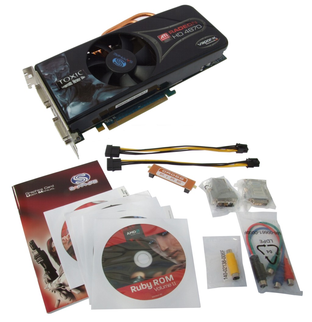 Das Zubehör der Karte bietet einiges: Neben einer Treiber-CD gibt es die 3DMark Vantage Advanced Edition, PowerDVD 7 und DVD Suite von CyberLink sowie eine "Ruby ROM"-DVD mit diversen Spieledemos. Darüber hinaus werden zwei PCI Express-Stromkabel, eine CrossFire-Bridge, ein DVI-auf-D-SUB-, ein DVI-auf-HDMI-, ein S-Video-auf-Composite- sowie ein S-Video-auf-YUV-Adapter mitgeliefert.