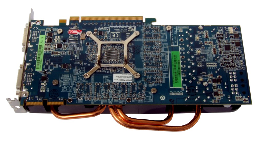 Vorder- und Rückseite der HD 4870 Toxic. Deutlich zu erkennen sind auch die beiden Bridge-Steckplätze für die CrossFireX-Funktion der HD 4870 sowie die Heatpipes des Vapor X-Chambers.