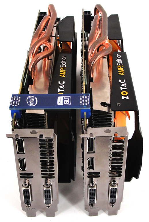 Der Dual-Fan-Kühler mit vier Heatpipes sorgt dafür, dass die GPUs sowohl im Idle als auch unter Volllast bei angenehmen Temperaturen von 29°C bzw. 65°C arbeiten können. Auch in Sachen Geräuschentwicklung kann die AMP!-Kühlung ihre Stärken zeigen. Durch den Einsatz einer zweiten GPU saugt das Netzteil zusätzliche 179 Watt aus der Steckdose, so dass in Summe circa 468 Watt bei Belastung unseres Testsystems anfallen. Damit liegen die SLI-Gespanne GTX 670 und GTX 680 beinahe gleichauf. Bei den heutigen und zukünftigen Strompreisen will die Anschaffung eines solchen Stromfressers wohl überlegt sein! Der Charme dieser Konfiguration ist aber ebenfalls nicht zu vernachlässigen! Nachteilig ist lediglich der benötigte Platzbedarf von zwei Karten, der sich dann auf sechs Slots beläuft.