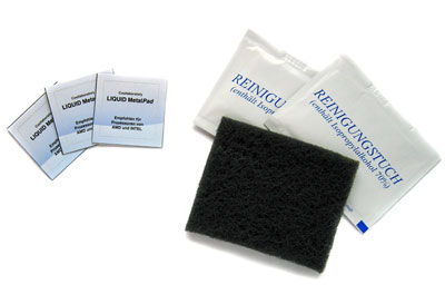 Zu guter Letzt noch ein Hinweis. Falls das mitgelieferte Reinigungsset verwendet wird, sollten sie den Metallschliff nur auf Metall-Heatspreadern verwenden. Zudem kann durch den Metallschliff die Identifikationsschrift des Prozessors entfernt werden, was einen Garantieverlust zur Folge hat. Nichtsdestotrotz waren wir angenehm überrascht, wie einfach sich das Liquid MetalPad wieder entfernen lies. Es waren kaum Rückstände vorhanden.