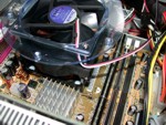 Installiert wird der CNPS 5700D-CU mit 2 Haken die sich schon am Oberbau des Kühlers befinden. Zuerst muss der Kühler an einer Seite eingehängt und dann nach unten abgesetzt werden. Danach können die auf dem unteren Bild zu sehenden 2 schwarzen Kunststoffhaken nach unten geschoben werden. Nach dieser Montage sitzt der 500 Gramm (mit Lüfter) schwere Kühler durch das Rentention-Modul perfekt auf der CPU. Allerdings sollte man erwähnen, dass Intel das maximale Gewicht eines Kühlers mit 450 Gramm angibt. Somit empfiehlt auch Zalman vor allem bei einem Transport Vorsicht walten zu lassen, allerdings befindet sich das Gewicht des Kühlers noch in einem zu verantwortenden Rahmen...