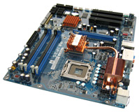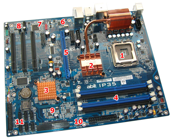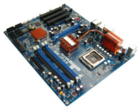 Prinzipiell hat Abit das IP35 als Standard-ATX-Platine konzipiert und muss auf den vorgegebenen Abmessungen (12,0 x 9,6 Zoll) die zahlreichen Ausstattungsmerkmale unterbringen. Das Dual-Chipsatz-Design sieht dabei die traditionelle Aufspaltung des Layouts in zwei wesentliche Bereiche vor. Legen wir die Platine richtig herum vor uns und ziehen direkt unterhalb des Back-Panels einen waagrechten Strich über das Board, finden wir oberhalb dieser Linie die P35-Northbridge (Intel MCH), den LGA775 CPU-Sockel, sowie vier DDR2-DIMM-Sockel für bis zu 800 MHz schnellen DDR-Speicher der zweiten Generation. Die Kühlung der Komponenten ist durchweg passiv, setzt auf eine Heatpipe-Verbindung zwischen den Spannungswandlern und der Northbridge und wurde unter dem Markennamen "Silent OTES" zusammengefasst. Die Southbridge ist vom Rest der Kühlung entkoppelt. Des Weiteren finden wir einen 4-Pin Anschlus namens ATX4P1 auf der Platine. Dieser Port soll Grafikkarten im PCIEXP1-Slot mit zusätzlicher Leistung versorgen - ein Feature das wir vor allem von den ersten PCIe-Boards kannten, als Netzteile mit PCI Express Stromanschlüssen kaum verbreitet waren. Das "übliche Problem" zwischen den DIMM-Sockeln und dem primären PEG im Zusammenspiel mit langen Grafikkarten besteht auch beim Layout des IP35: Die Sicherungshaken der DDR2-Module sind bei installierter Grafikkarte nur eingeschränkt zu betätigen. Ein Manko, aber kein schwerwiegender Fehler im Layout.
