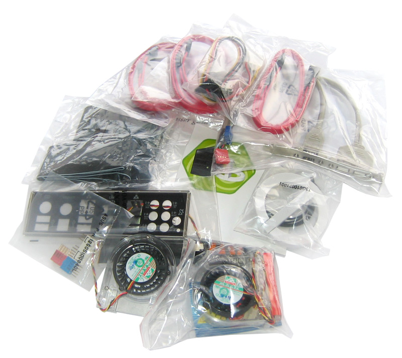 Beim Öffnen des Kartons des neuen P5K Premium fallen einem gleich zahlreiche Komponenten in die Hände. So finden wir neben einem Handbuch für das Mainboard (Englisch) und einem separaten User-Guide für die Wireless-LAN Funktion (Englisch), eine Treiber-CD, eine stylische Antenne für das drahtlose Netzwerk, diverse Kabel und Adapter, ein Slotbracket und zwei der optionalen Lüfter. Letztere lassen sich bei zu hoher Wärmeentwicklung innerhalb des Gehäuses auf die Heatpipe-Konstruktion klemmen und die Temperaturen der Chipsatzkomponenten absenken. In der Regel ist ein passiver Betrieb jedoch kein Problem. Mehr dazu ab Seite 14, wenn wir uns näher mit den Temperaturen des Mainboards beschäftigen. Folgend der gesamte Lieferumfang im Überblick: