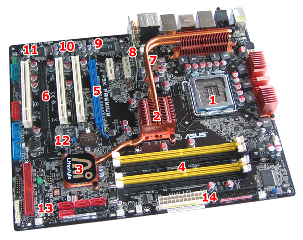 Im unteren Mainboardbereich befinden sich die Erweiterungsslots, die Southbridge, die Front-Panel-Anschlüsse, SATA2-Ports und der einzige IDE-Kanal, sowie Pins für die externen USB- und FireWire-Ports sowie den COM-Anschluss. Hier haben die Asus-Ingenieure saubere Arbeit geleistet und unserer Meinung nach keine groben Fehler beim Layouting der Platine begangen. Durch den relativ weit unten liegenden PCIEX16_1 und die DIMM-Sockel fallen beim Einbau zweier Dual-Slot Grafikkarten zwei von drei PCI-Ports weg. Als Alternative hätte man noch einen der kaum benutzten PCI Express x1 Anschlüsse mit einem PCI tauschen können. Auf der folgenden Grafik haben wir nochmals alle wichtigen Stellen auf der Platine markiert und geben gleichzeitig einen kleine Übersicht zur Platzierung der einzelnen Chips und Funktionalitäten auf dem P5K Premium von Asus.