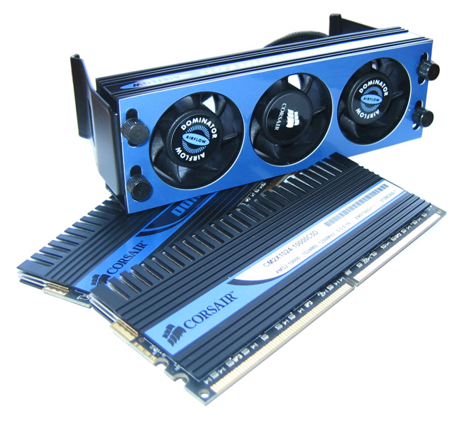 Für einen stabilen Betrieb hat man dem Lieferumfang den so genannten Dominator Airflow beilegt, der mit drei 40 mm-Lüftern für zusätzliche Kühlung sorgen soll und etwa fünf bis sechs Watt an Leistung verbraucht. In der Praxis war der Einsatz dessen auf unserem Testsystem jedoch nicht nötig (CPU-Kühler-Luftstrom in Richtung DIMMs) und die verbauten Kühlrippen konnten auch so die anfallende Abwärme kompensieren bzw. ableiten - die hier eingesetzte Dual-Path Heat Xchange (DHX) Technologie funktioniert gut.
