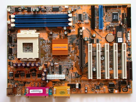 Die Platine selbst ist gelblich gefärbt und besitzt so manchen farblichen Akzent, so sind z.B. die RIMM-Slots in blau gehalten, sowie die IDE Anschlüsse abgesetzt. Wobei wir schon bei dem Thema wären, welches jedem Tester und End-User die Wut hochkommen lässt. Am untersten Punkt der Platine sitzt der Disketten Anschluss und lässt sich in einem Bigtower so gut wie nicht verwenden, denn nicht mal die mitgelieferten Kabel sind in angemessener Länge. Hier bleibt nur zu sagen, dass scheinbar die Designer von Elitegroup nicht in der Lage sind eine Platine nach den Ansprüchen ihren Käufer zu bauen.