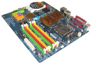 Prinzipiell haben die Ingenieure von Gigabyte das neue P35C-DS3R als Standard-ATX-Platine konzipiert und müssen auf den vorgegebenen Abmessungen (12,0 x 9,6 Zoll) die zahlreichen Ausstattungsmerkmale unterbringen. Das Dual-Chipsatz-Design (P35 + ICH9) sieht dabei die traditionelle Aufspaltung des Layouts in zwei wesentliche Bereiche vor. Oberhalb des PEG finden wir die Northbridge, den CPU-Sockel samt Spannungswandler (keine separate Kühlung), die insgesamt sechs DDR2- und DDR3-DIMM-Sockel und diverse Anschlüsse. Die Kühlung von North- und Southbridge wurde komplett passiv gehalten, was vor allem der Lautstärkeentwicklung sehr entgegen kommt - Nähere Informationen zu den resultierenden Temperaturen ab Seite 13. In diesem Bereich können wir keine Mängel im Layout feststellen und alle verfügbaren Anschlüsse sowie Steckplätze sind optimal erreichbar. Auch die Befestigungshaken der DIMM-Sockel kollidieren nicht mit langen Grafikkarten, da durch die Verlagerung eines PCI Express x1 über den PEG etwas Freiraum gewonnen wurde.
