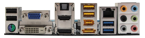Am I/O-Shield des GA-H55-UD3H hat man einen PS/2-Anschluss, acht USB-Ports (alle 2.0), Audio-Ausgänge (Klinke und optisch) und den RJ45-Ethernet-Anschluss platziert. Außerdem stehen für die Grafik-Ausgabe der Clarkdale-Prozessoren (mit HD-Grafik) DVI-D, D-Sub und HDMI zur Verfügung. Alle weiteren Ports sind auch hier über separate Slot-Brackets oder Front-Panel-Elemente nutzbar. Entsprechende Brackets befinden sich nicht im Lieferumfang.
