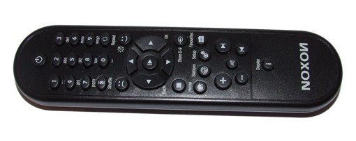 Die Eingabe der nötigen Bedienungsschritte erfolgt mittels der mitgelieferten Fernbedienung, die hinsichtlich ihres Aufbaus einer Handy-Tastatur nicht unähnlich ist. Der obere Teil der Fernbedienung besteht aus einem Standby-Knopf sowie dem Nummernblock, der zugleich der Eingabe von Buchstaben dient. Darunter befinden sich die Navigationstasten, mit deren Hilfe man die jeweiligen Menüs ansteuern kann. Die mittlere Taste dient der Wiedergabe bzw. der Pausierung der Wiedergabe. Darunter sind diverse weitere Tasten angeordnet, die der Steuerung der sonstigen Funktionen des NOXON dienen. Beispielsweise kann man hier auf das Setup-Menü zugreifen, den Favoriten-Ordner mit den Lieblingssendern aufrufen, auf die Startseite zurückspringen und anderes mehr. Die untenstehende Abbildung zeigt die Anordnung der Tasten.