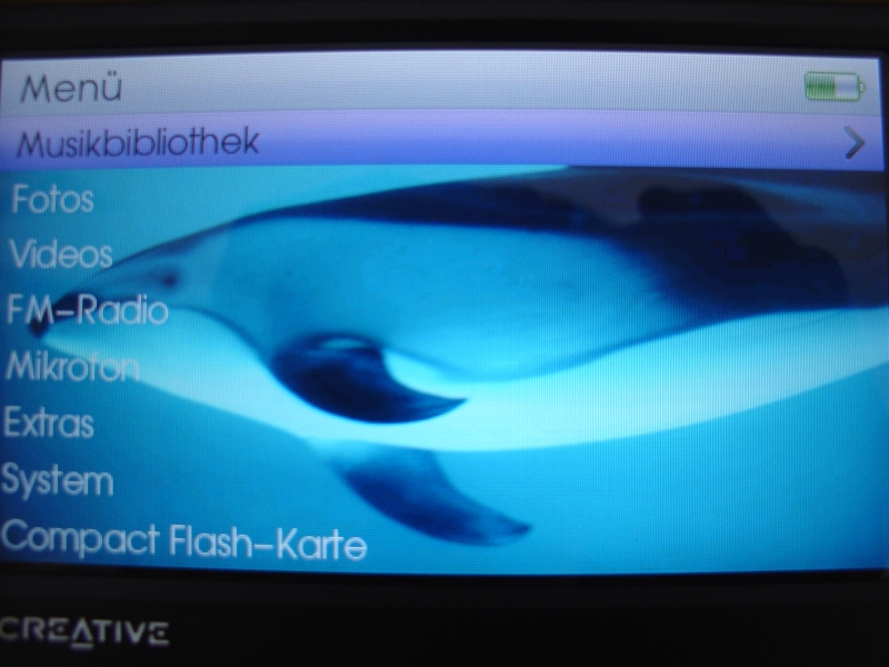 Mit dem Logo von Creative wird man beim Einschalten des Geräts kurz begrüßt. Es stehen sofort die Anwendungen Musikbibliothek, Fotos, Videos, FM-Radio, Aufnahme, Extras, System und Compact-Flash Karte zur Verfügung. Am rechten oberen Displayrand wird die Stärke des Akkus angezeigt, der Akku ist zudem austauschbar und kann durch einen Zweitakku ersetzt werden, um eine noch höhere Bereitschaft des Multimedia Players zu erreichen. Die Menüpunkte können, wie oben schon beschrieben, je nach Nutzer eingestellt und individuell angepasst werden. In der Menügruppe Extras kann der Nutzer das Datum und die Uhrzeit einstellen, das Wechselspeichermedium verwalten und den Organizer einrichten. Im Organizer kann man den Kalender, seine Aufgaben und die Kontakte betrachten, die man zuvor mit Microsofts Outlook vom heimischen PC synchronisiert hat.